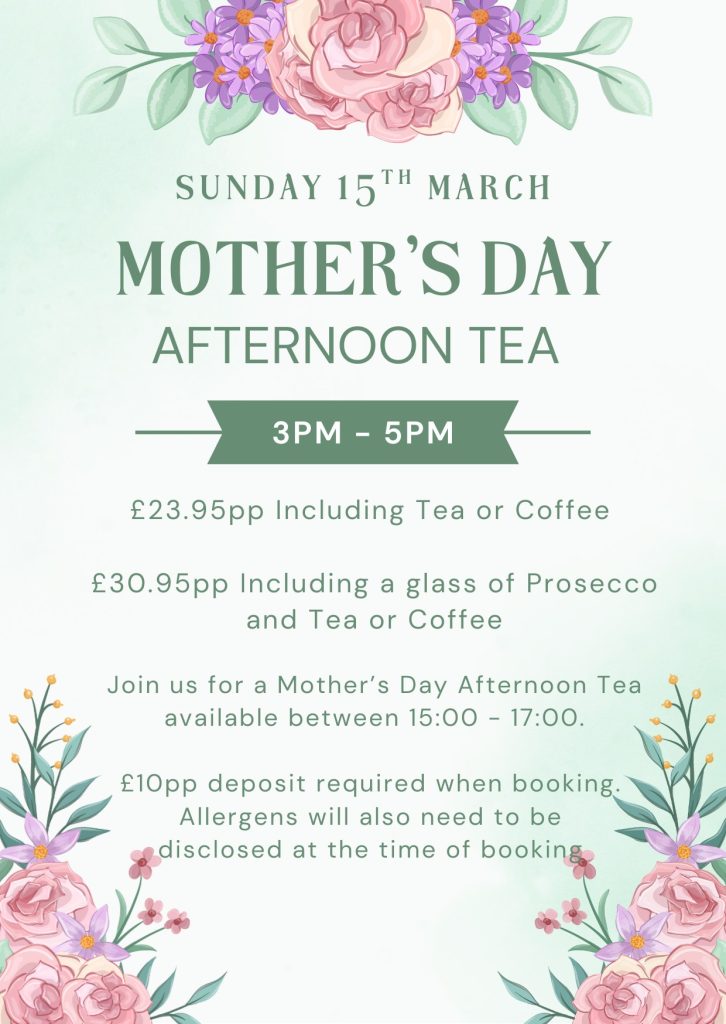 Join us on Sunday 15th March from 3pm-5pm and enjoy a delightful spread, plus tea or coffee for £23.95pp, or upgrade to include a glass of Prosecco for just £30.95pp.